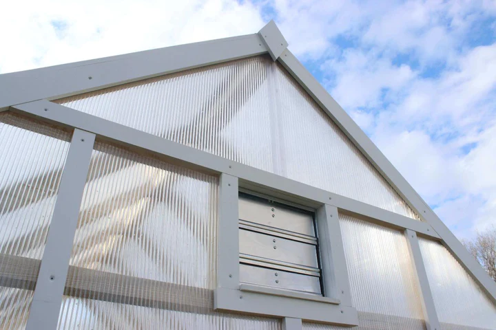 • Roof and wall panels are heavy-duty 8 mm multi-wall polycarbonate. This UV-resistant greenhouse material is 12 times lighter than glass.
