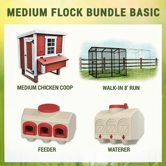- The Medium Flock Bundle Basic includes the Medium Chicken Coop, Walk-In 8 Ft. Chicken Run, Chicken Feeder, and Chicken Waterer.