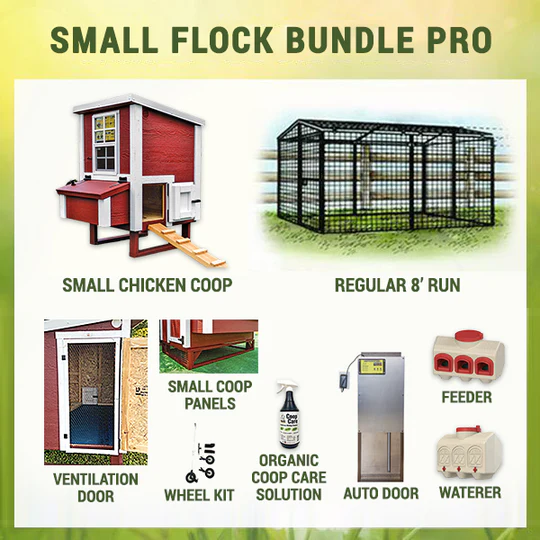 - The Small Flock Bundle Pro includes the Small Chicken Coop, Regular 8 Ft. Chicken Run, Chicken Feeder, Chicken Waterer, Organic Coop Care Solution, Automatic Chicken Coop Door, Chicken Coop Wheels, Small Ventilation Door, and Small Chicken Coop panels.