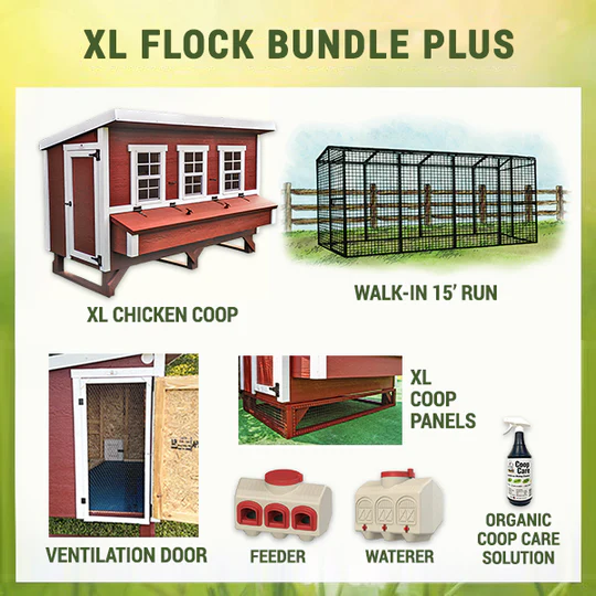 • The XL Flock Bundle Plus includes the XL Chicken Coop, Walk-In 15 Ft. Chicken Run, Chicken Feeder, Chicken Waterer, Organic Coop Care Solution, Large Ventilation Door, and XL Chicken Coop Panels.